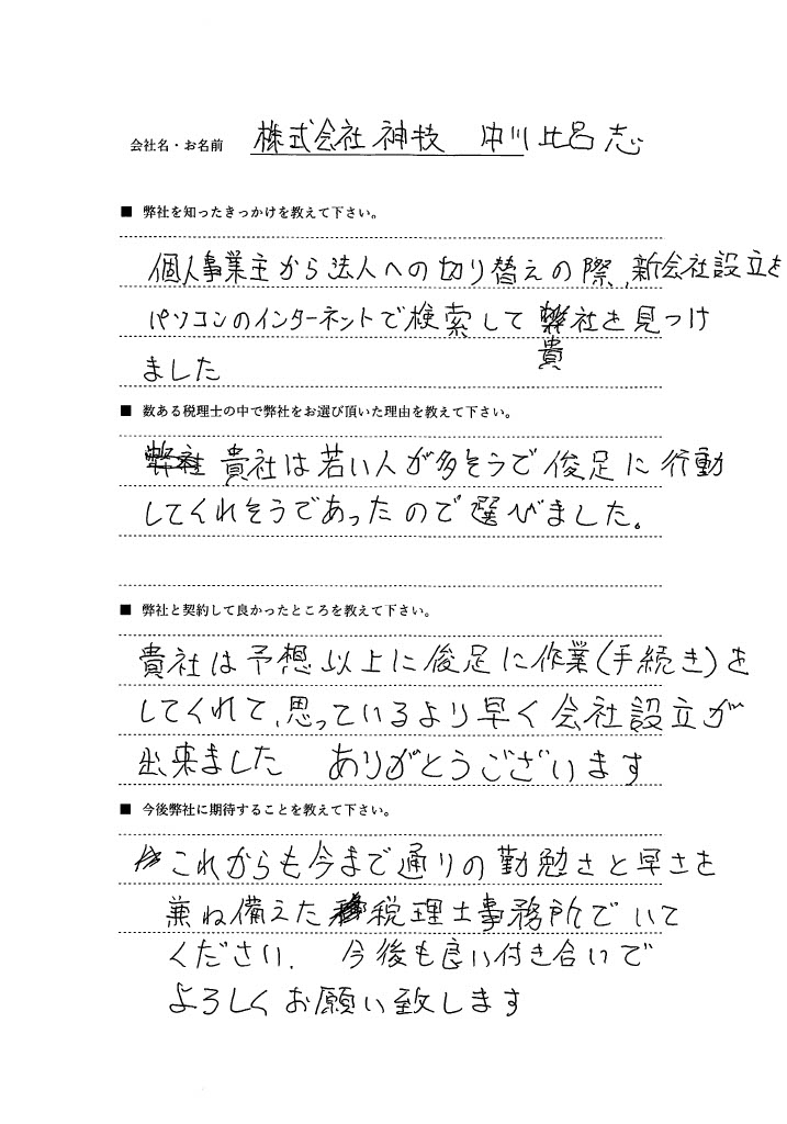 ですから、豊富な設立支援による最適な設立提案はもちろんですが、会社設立後の顧問契約時においても、数字の可視化による様々な改善ご提案、より良い条件での融資のご相談、会社の利益を残すための決算作成など、お客様が一番得をし、会社の成長に繋がるご提案をさせていただきます。また万が一税務署から税務調査の依頼があっても、元国税調査官の職員がおりますので、安心してお任せいただけます。