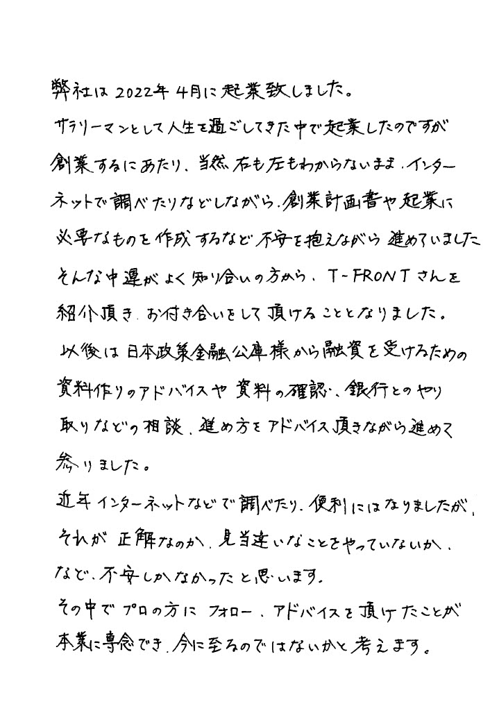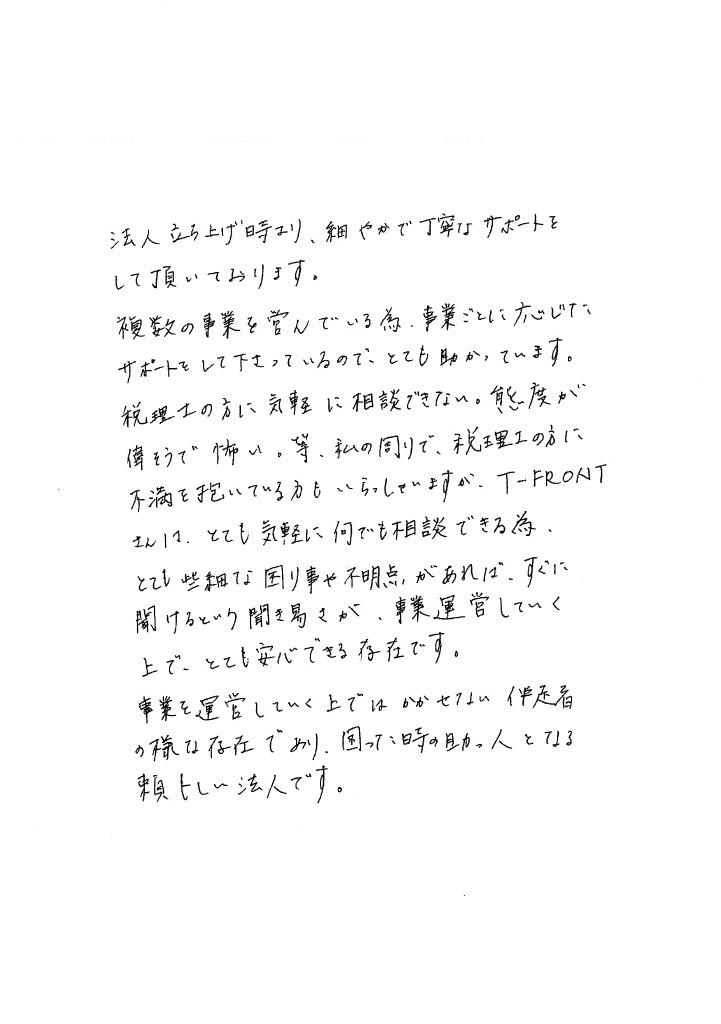 全ての経営者様に「T-FRONTに頼んでよかった!」と言っていただけるよう、顧問料以上の価値を提供することをお約束します。
